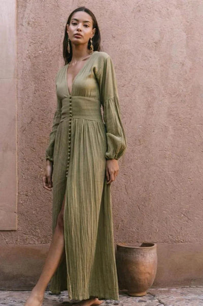 Giselle V yakalı Plisse Maxi Milkmaid Elbise
