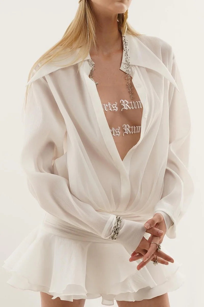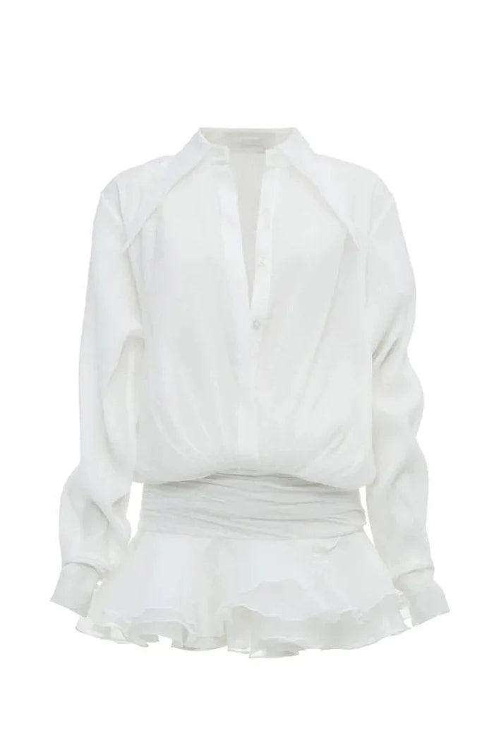 Gardırobunuzu Pliseli Volanlı Mini Elbise ile yükseltin. Derin V yaka, sivri yaka ve pileli düşük bel tasarımına sahip bu elbise, sofistike detayları eğlenceli unsurlarla birleştiriyor. Volanlı detaylar kadınsı bir dokunuş katarken, mini uzunluk şık ve modern bir görünüm sunuyor.