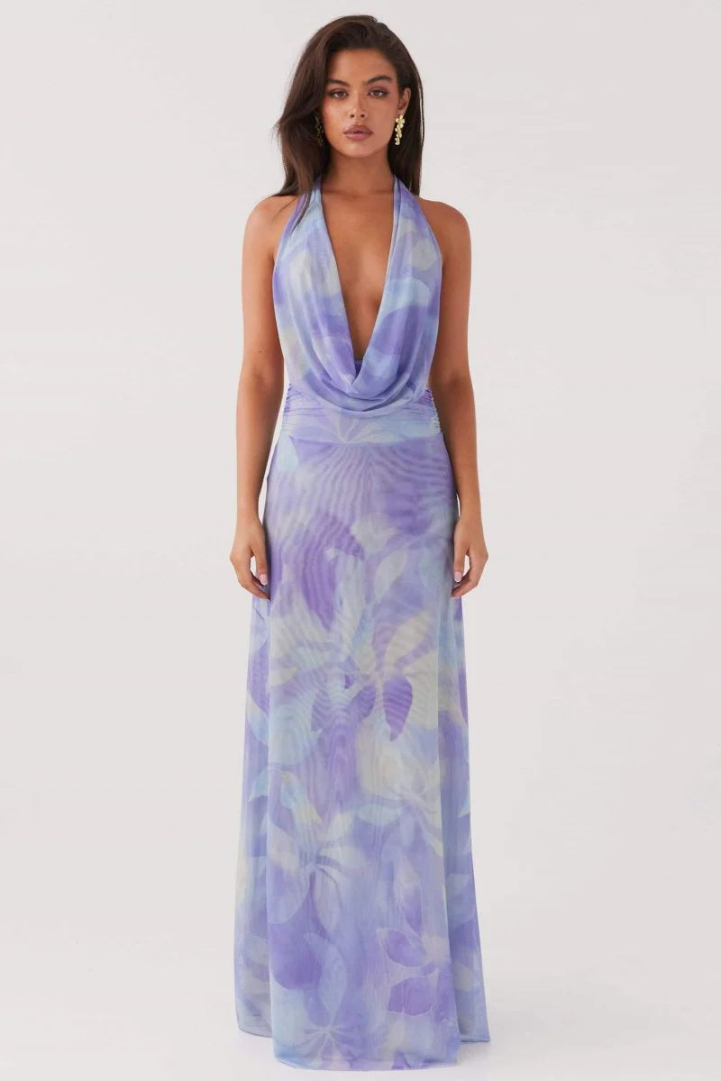 Bu zarif maksi elbise, düşük dekolteli yaka, boyundan bağlamalı tasarım ve açık sırt ile sofistike ve çekici bir görünüm yaratıyor.