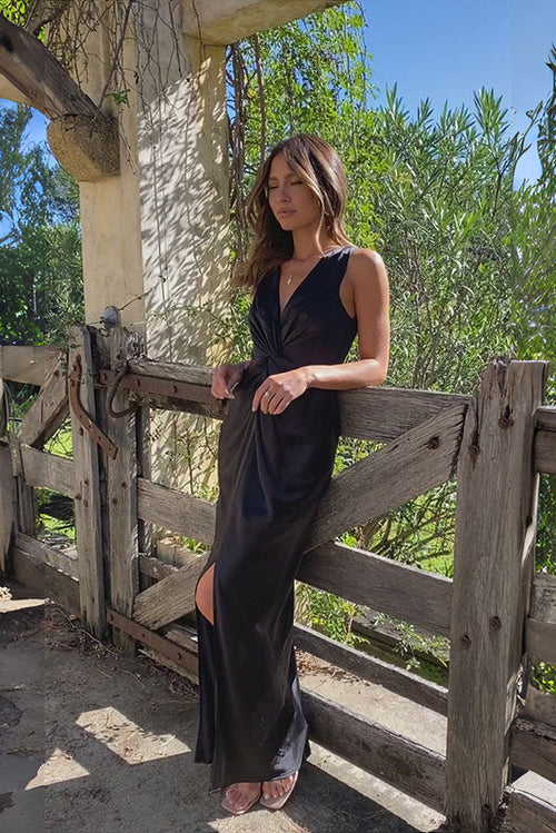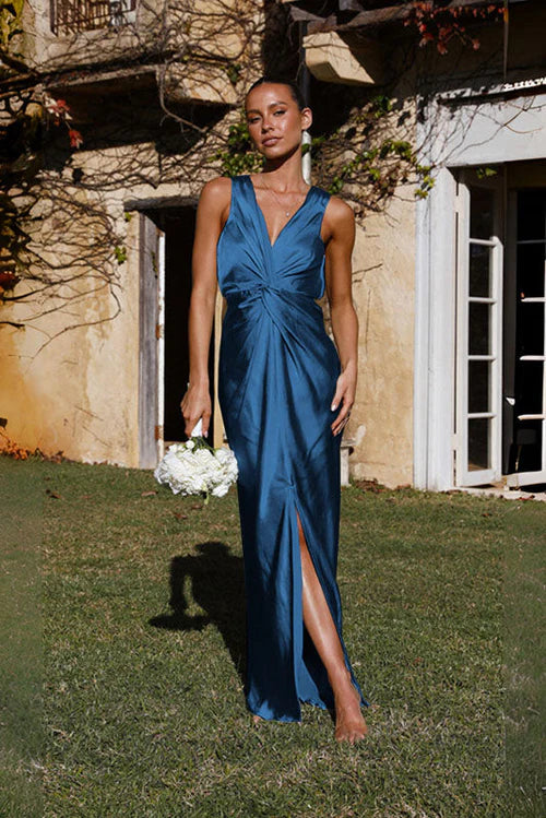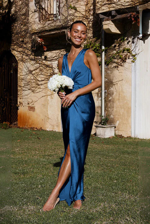 Bu zarif, yüksek belli, derin V gece elbisesiyle bakışları üzerinize çekin. Kolsuz, sırtı açık bir tasarıma sahip olan bu model, şık ve sofistike kesimiyle silüetinizi öne çıkarır.