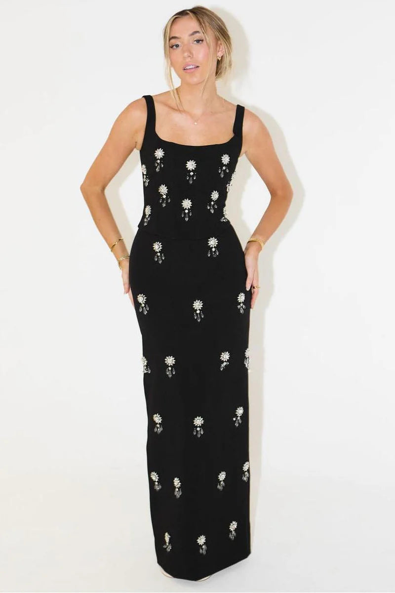 Bu iki parçalı set, sofistike ve çekiciliğin bir ifadesidir. Eteğin kristal süslemeleri zarif bir şekilde dökülürken, yapılandırılmış üst kısım belirgin ve hoş bir şekil oluşturur.